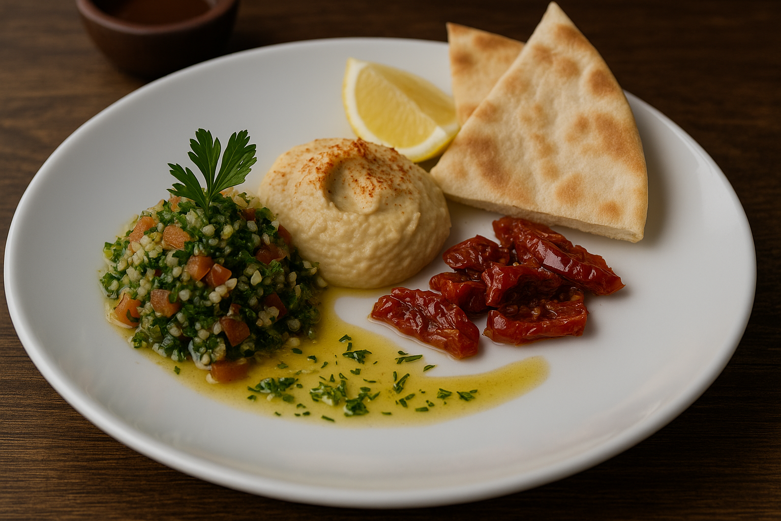 Duo vonTabouleh&Gegrillten Gemüse mit getrocknetenTomaten und warmem Brot