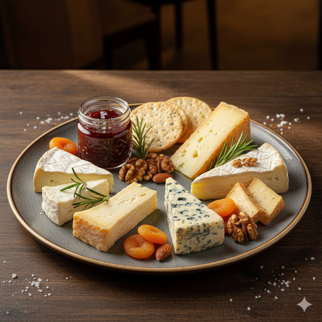 Feine französische Käseauswahl mit fruchtigem Chutney und knackigen Nüssen.
